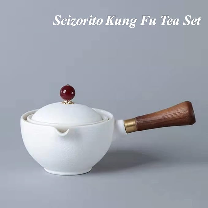 - [Design]: Our Scizorito Travel tea set use 360 degree suspension design, the filter and teapot are detachable by rotation, the suspension design does not fall, the wooden handle turns the water out, creative design, easy to use.The size of the Kung Fu tea set is a little small, please purchase with caution.