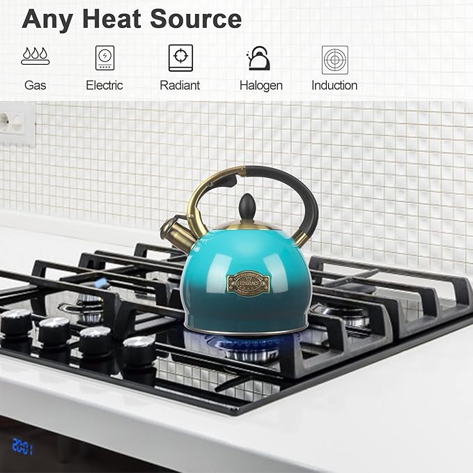 - Perfect Whistling Sound of Teakettle: This tea kettle for stovetop has a tight-fitting lid keeps steam in the hot tea kettle for rapid heating, and realse pleasant whistles sound when water reaches a boil, Loud enough to alarm you when you busy in the next room.