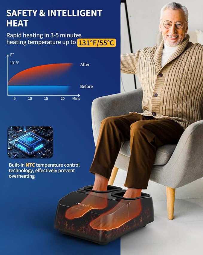 - Safety & Intelligent Heat Function - Smart NTC Temperature Control Technology (Up to 131°F/55℃), rapid heats up with constant temperature. Gently eases cold feet for chilly winter or rainy days. Hot compresses massage promote circulation, effectively relaxes muscle stiffness and improves sleep quality. Turn on/off anytime for personalized warmth