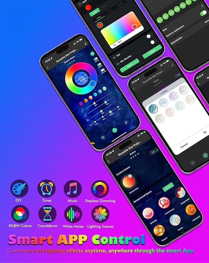 - Remote, App Controlled & Timer Function - Galaxy light can be freely controlled by IR remote control or smart app, easy to change light effects, adjust brightness, speed, music selection, volume and timer. Our smart app allows you to have advanced control over the LED lights and access to incredible lighting features like the customized DIY modes and a convenient timer function. This galaxy light projector can be set to timer off for either 1 or 2 hours, or automatically stand by after 4 hours.