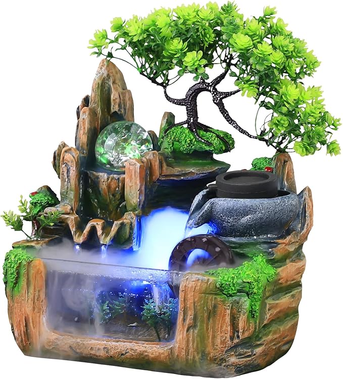 Fountains Waterfall Décoration,Indoor Relaxation Desktop Fountain Waterfall,Atomizing Humidifier,Desktop Fountain Waterfall with Rockery,Plant,Tabletop Fountain LED Waterfall for Home Office Desk