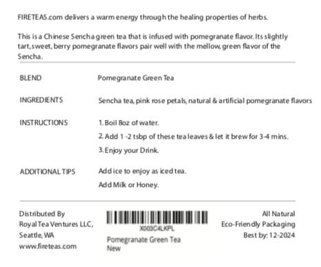 - Sencha OP tea, pink rose petals, natural and artificial pomegranate flavors