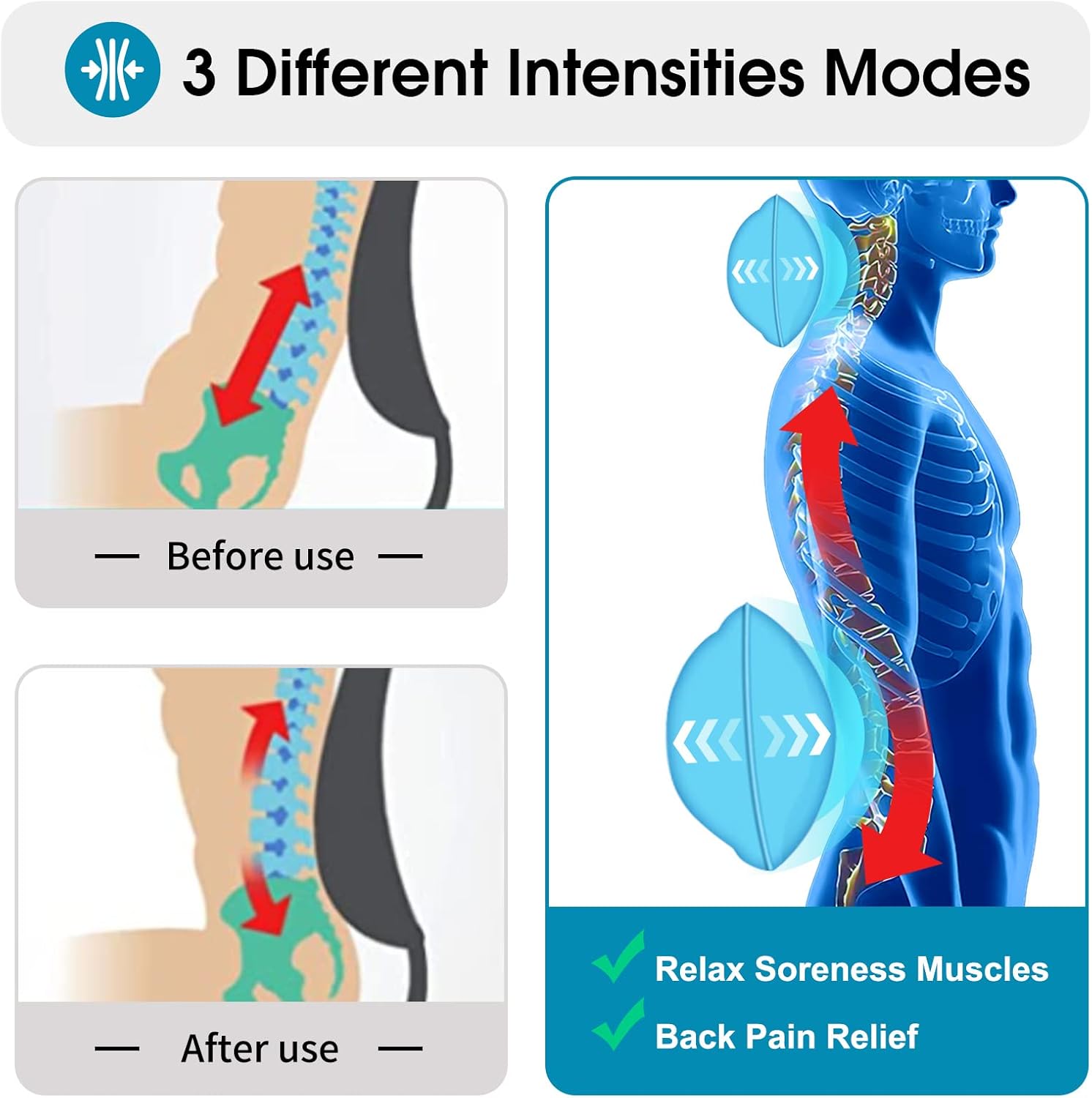 - Customized Massage - The back massager for chair with remote control allows you to customize the massage modes(M1, M2, M3) and intensities (Low/Medium/High), which brings you relaxation throughout the body. With 3 levels and 3 modes of pressure & vibration massage for neck, upper back, lower back, wist,thighs, you will enjoy a comfortable massage life.