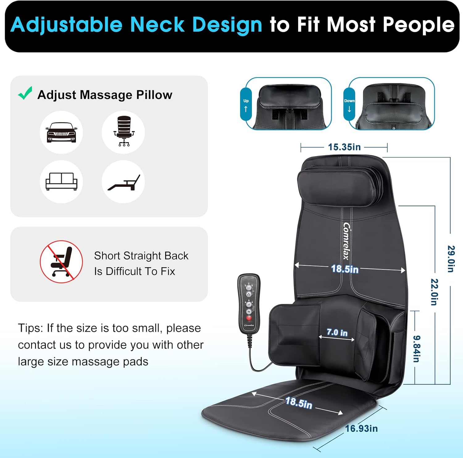 - Height-adjustable Neck Massager - Our massage chair pad with a height-adjustable neck massager. It can be adjusted up & down to fit most users of different heights by velcro. As it stars to work, you seem to feel two hands gently pressing against the sorest part of your neck, which relaxes you.