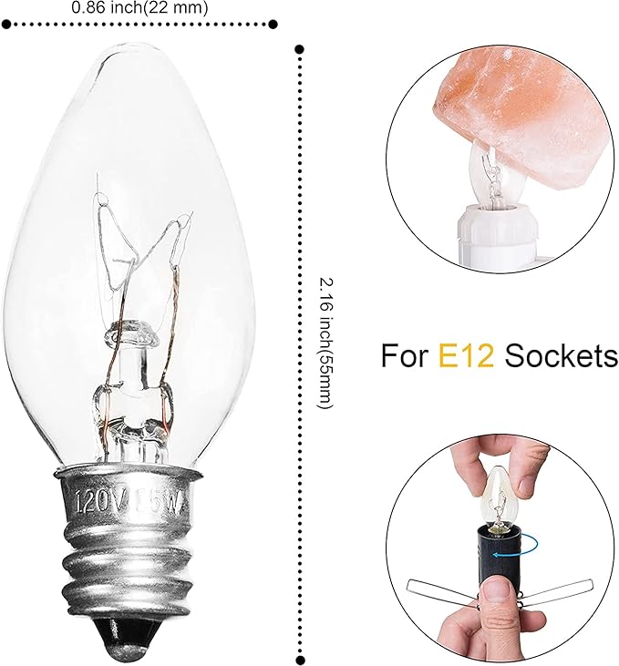 - SAFE TO USE: 100% new and tested Himalayan salt lamp replacement cord E12 Socket 110V-250V ,6-Pack 15watt Salt Lamp Bulbs is replaceable,the same as the halogen bulb, can heat up the salt lamp to volatile salt ions when it lights, specifically designed for salt lamps.