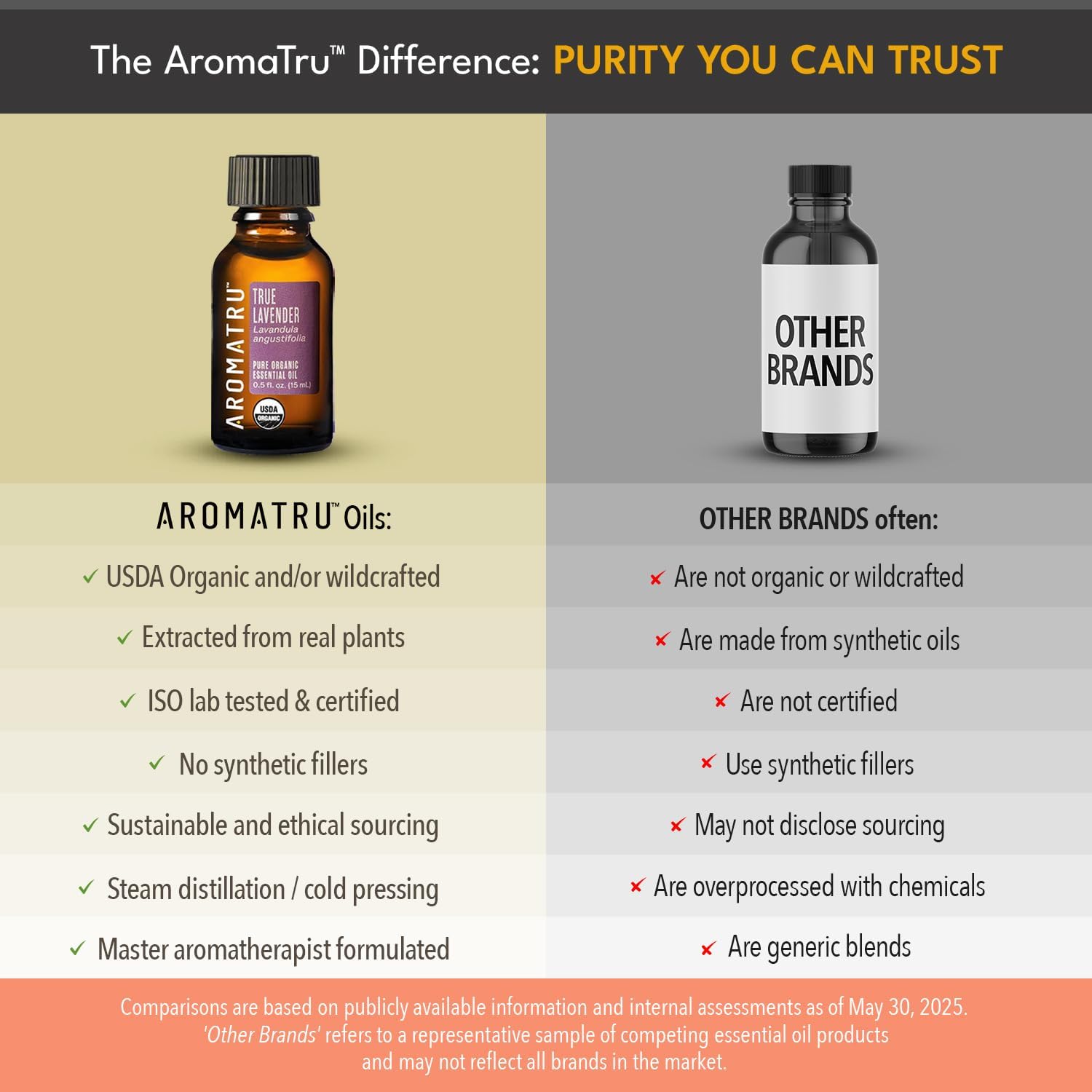 - THIRD-PARTY TESTED FOR QUALITY & AUTHENTICITY: Every AromaTru essential oil is ethically sourced and sustainable, then tested by an independent, ISO-certified lab to confirm identity, purity, and safety. Only oils that meet rigorous quality standards are bottled for use.