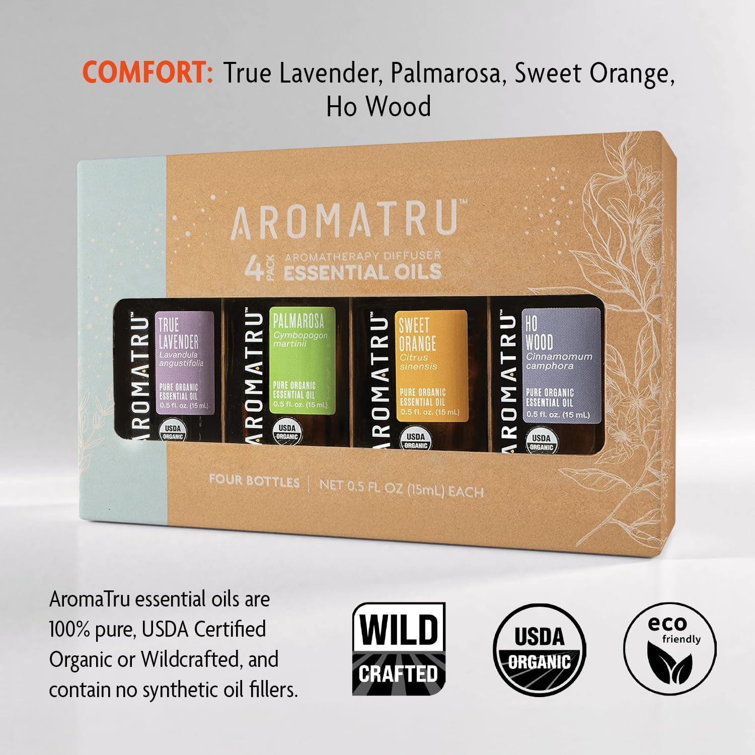 Comfort Essential Oil Kit – True Lavender, Palmarosa, Sweet Orange, and Ho Wood – Organic & Wildcrafted – ISO Certified – No Synthetic Fillers – Ethically Sourced