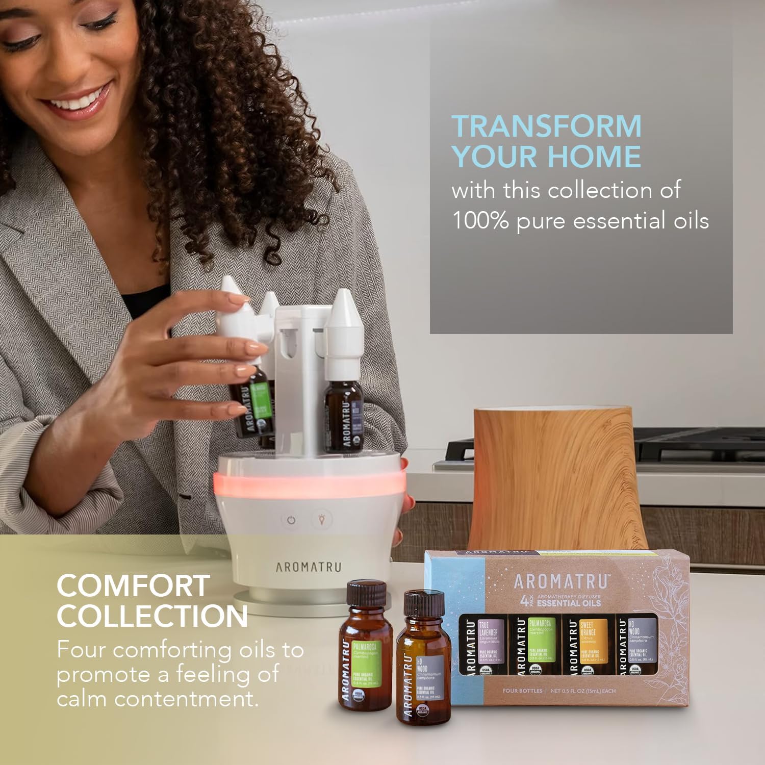 - COMFORT ESSENTIAL OIL COLLECTION – 4 BOTTLES (15ML EACH): Includes True Lavender, Palmarosa, Sweet Orange, and Ho Wood essential oils. This calming set is thoughtfully crafted to help ease stress and create a soothing, comforting atmosphere—perfect for diffusers, custom blends, or relaxation rituals. Droppers are included for easy, mess-free use.