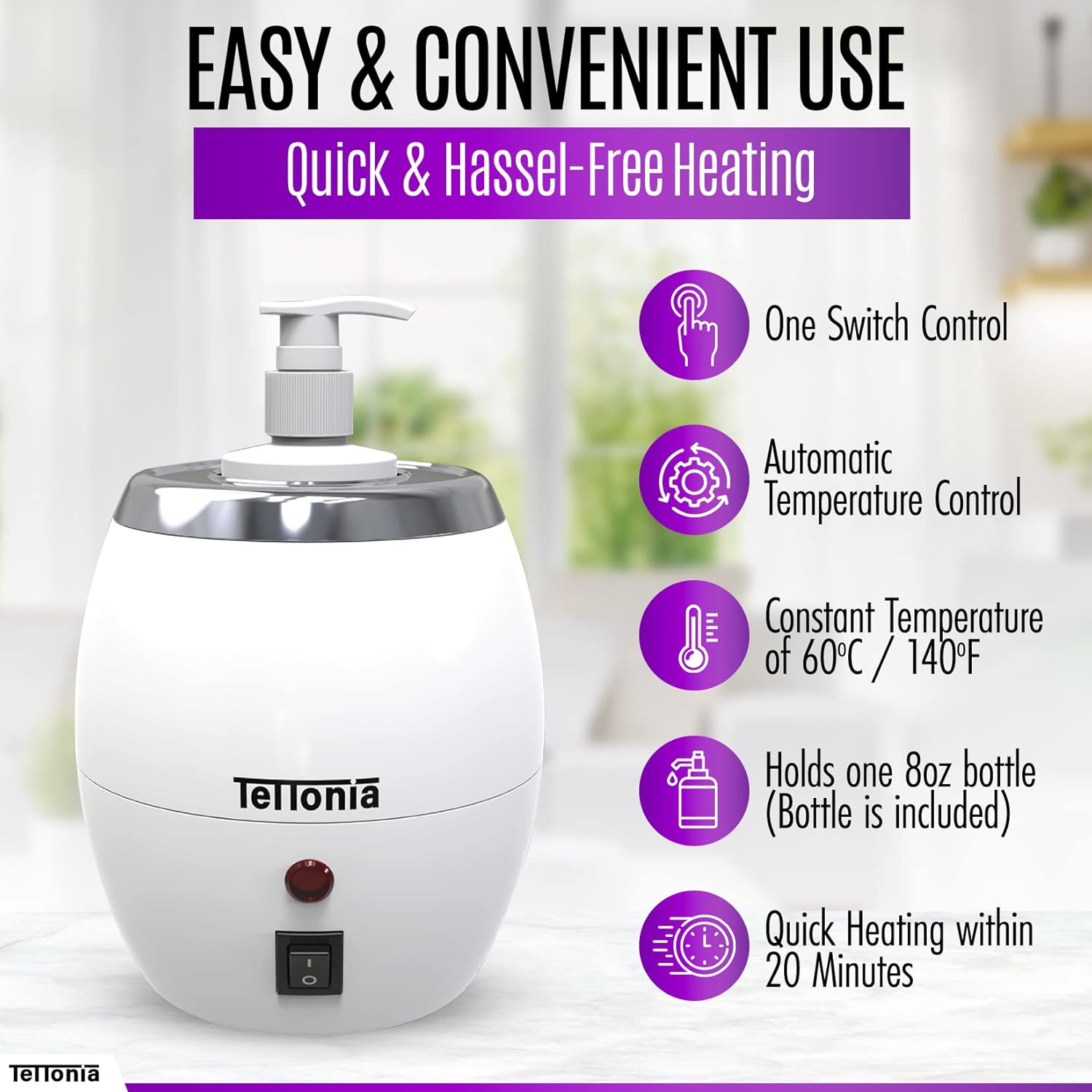 - HDPE Bottle: The Tettonia lotion warmer includes a convenient 8oz plastic bottle, the perfect massage accessory to store your favorite liquids, oils, lotions or creams! Order it for yourself or as a thoughtful gift idea for a friend or loved one, and you can be sure everyone will appreciate it!