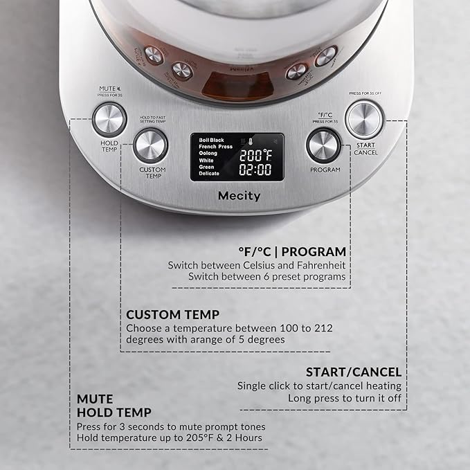 - πΊππππ π²πππ πΎπππ π΄ππ π - Being busy in daily work? Mecity tea kettle will auto maitain the set temperature for 10 minutes even you forot to activate keep warm mode. In keep warm mode, it could last up to 2 hours and maintain 205Β°F
