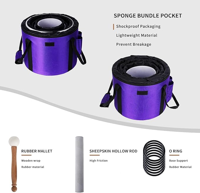 - Package includes: crystal singing bowl set (1* 6” wide Violet 432hz B Note, 1* 7” wide Indigo 432hz A Note, 1* 8” wide Blue 432hz G Note,1* 9” wide Green 432hz F Note, 1* 10” wide Yellow 432hz E Note, 1* 11” wide Orange 432hz D Note, 1* 12” wide Red 432hz C Note), 1* thick cowhide suede striker, 1* rubber mallet, 7* one O-ring, 2* carrying bags