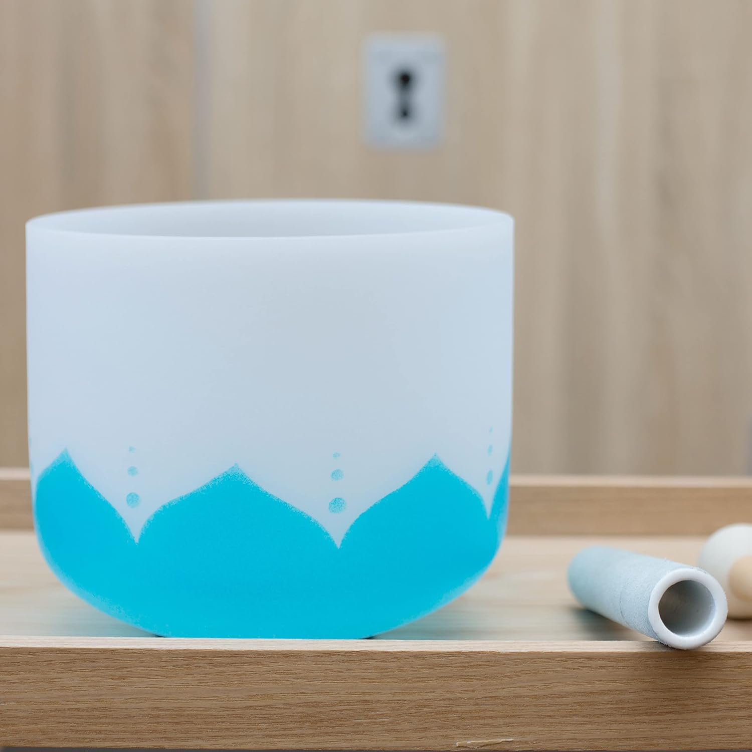 Leize Crystal Singing Bowl 432hz G Note Throat Chakra Blue Lotus Design 8" Wide with Suede Striker
