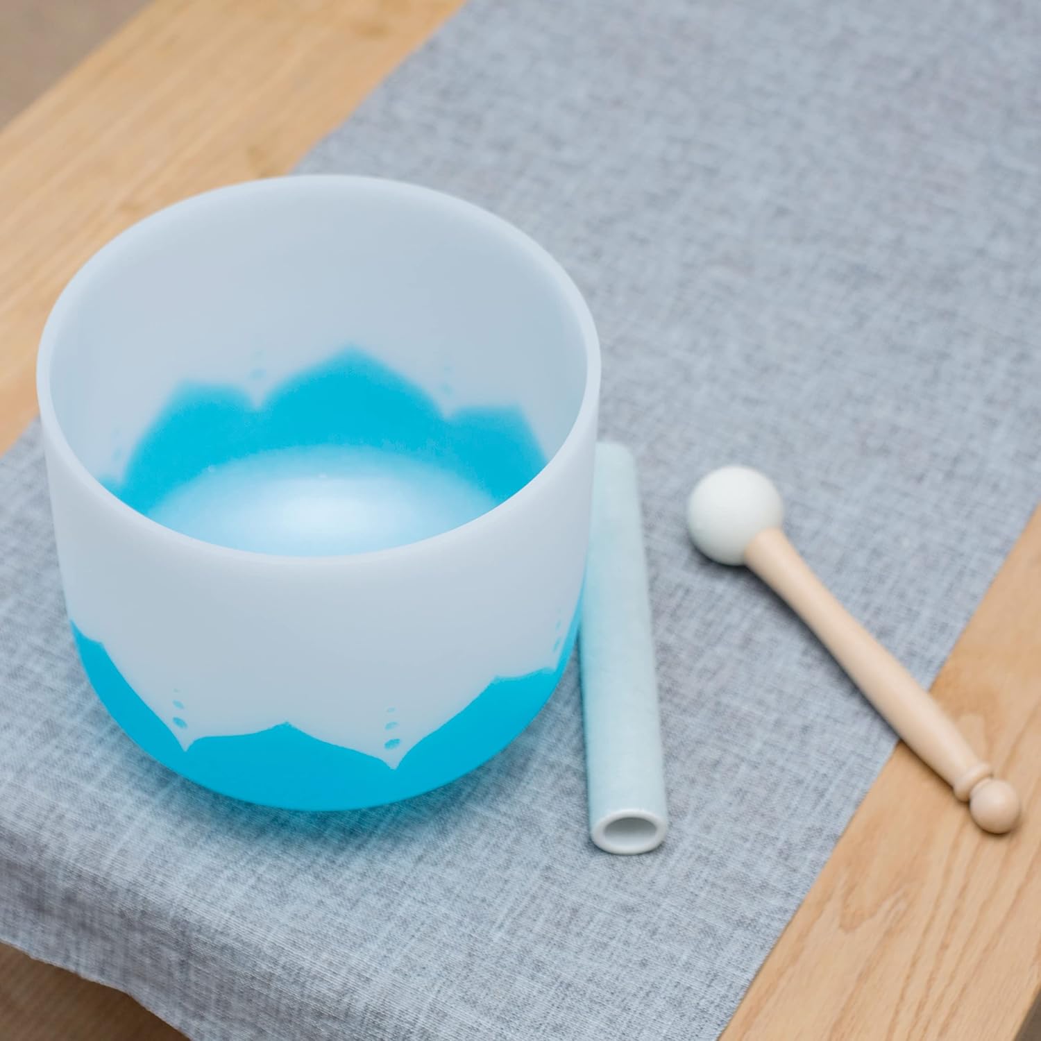 - Package includes: 1 * 8 inch wide blue lotus design high quality crystal singing bowl, 1 * thick cowhide suede striker, 1 * rubber mallet, 1 * one O-ring