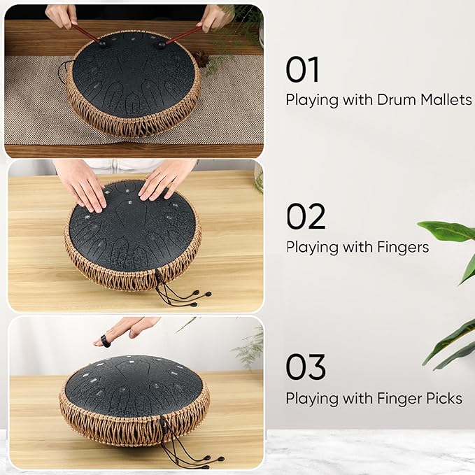 - Easy to Play and Carry: Steel drum has different ways to play, you can use the drumsticks and finger picks to play, and use your fingers to play directly; Tank drum can be used for different musical expressions; Steel tongue drum comes with music book, mallets and shoulder strap carrying bag, which is lightweight and convenient to carry to various place