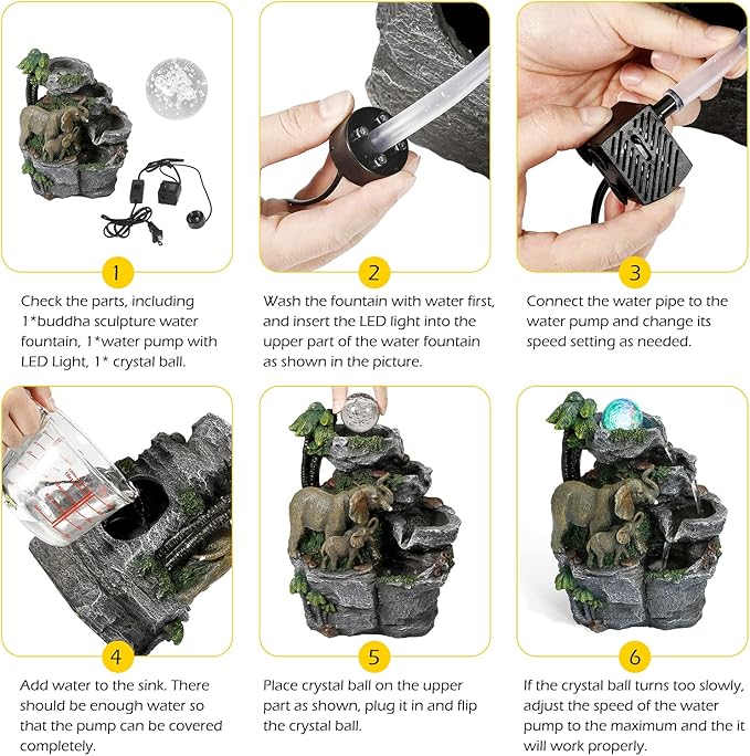 - 【3-Tier Elephant Water Fountain Indoor】 If you love nature and enjoy the gurgling water sound, our tabletop water fountain is perfect to choose from, tabletop waterfall fountain with a stream of water running down each tier, imitating the soothing sound of a small waterfall to create a zen atmosphere, allows you to relax, meditate or fall asleep easily. [Size: 9.0*5.5*11.0 inch]