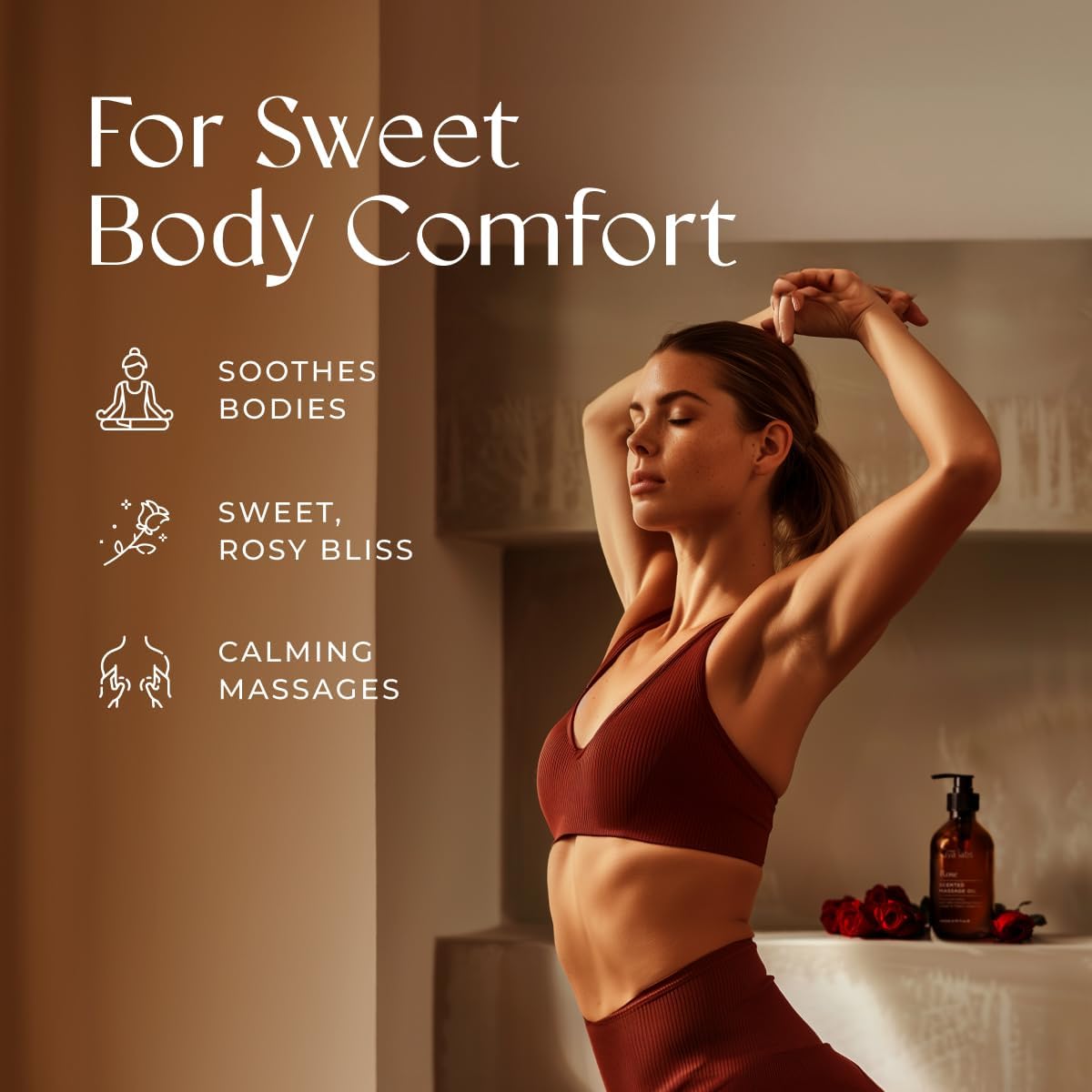 - Releases a rosy, rejuvenating scent. Infused with the soothing scent of rose otto oil, this warming massage oil is exactly what your senses and body need after a long day. Warm 1-2 pumps of this aromatherapy massage oil and massage the body.