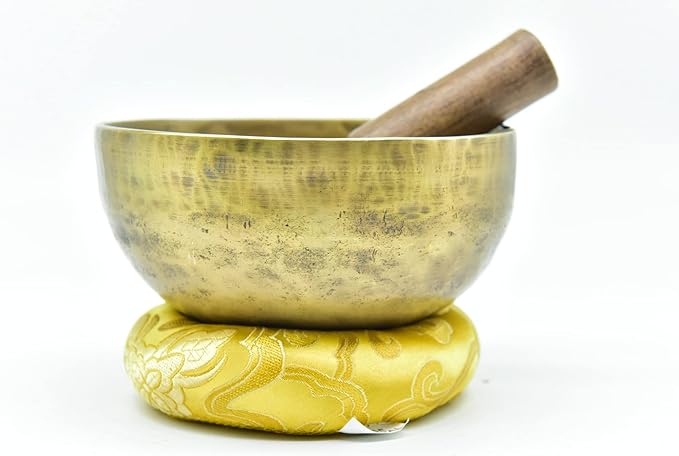 - Fits in your Palm ~ Perfect Gift: this singing bowl easily fits in the palm of your hand, looks great on your desk or shelf and adds harmonious flavor to your decor. Its approximately 5β diameter with 3β height. It weighs approx. 1lb /15.87 oz. Suede leather wrapped Wooden mallet (Striker) is approximately 5β and 1β thick. It weighs about 21.16 Oz (approx. 600 grams). hand sewn thick silk Yellow color cushion. Makes a Perfect Gift to anyone who loves Yoga and meditation.