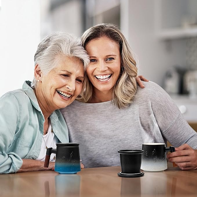 suyika Ceramic Tea Cup with Infuser and Lid, Gradient Embossed Large Tea Mug Wooden Handle for Steeping Loose Leaf, Tea Lover Gifts 15.2 oz / 450 ml,Matte Black