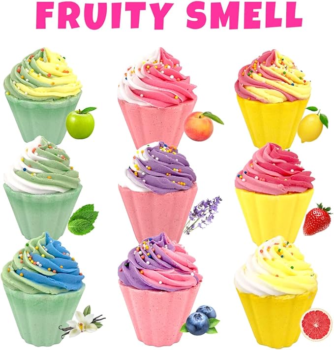 - 9 PACK KIDS BATH BOMBS: 9 Pieces 6.3OZ CUPCAKE Bath Bombs with Jewelry Inside, Each Bath Bomb Is Individually Packaged, They Float, Foam with Bubbles, and Fizzies and Color the Water, Which Is So Much Fun and Attractive for Girls
