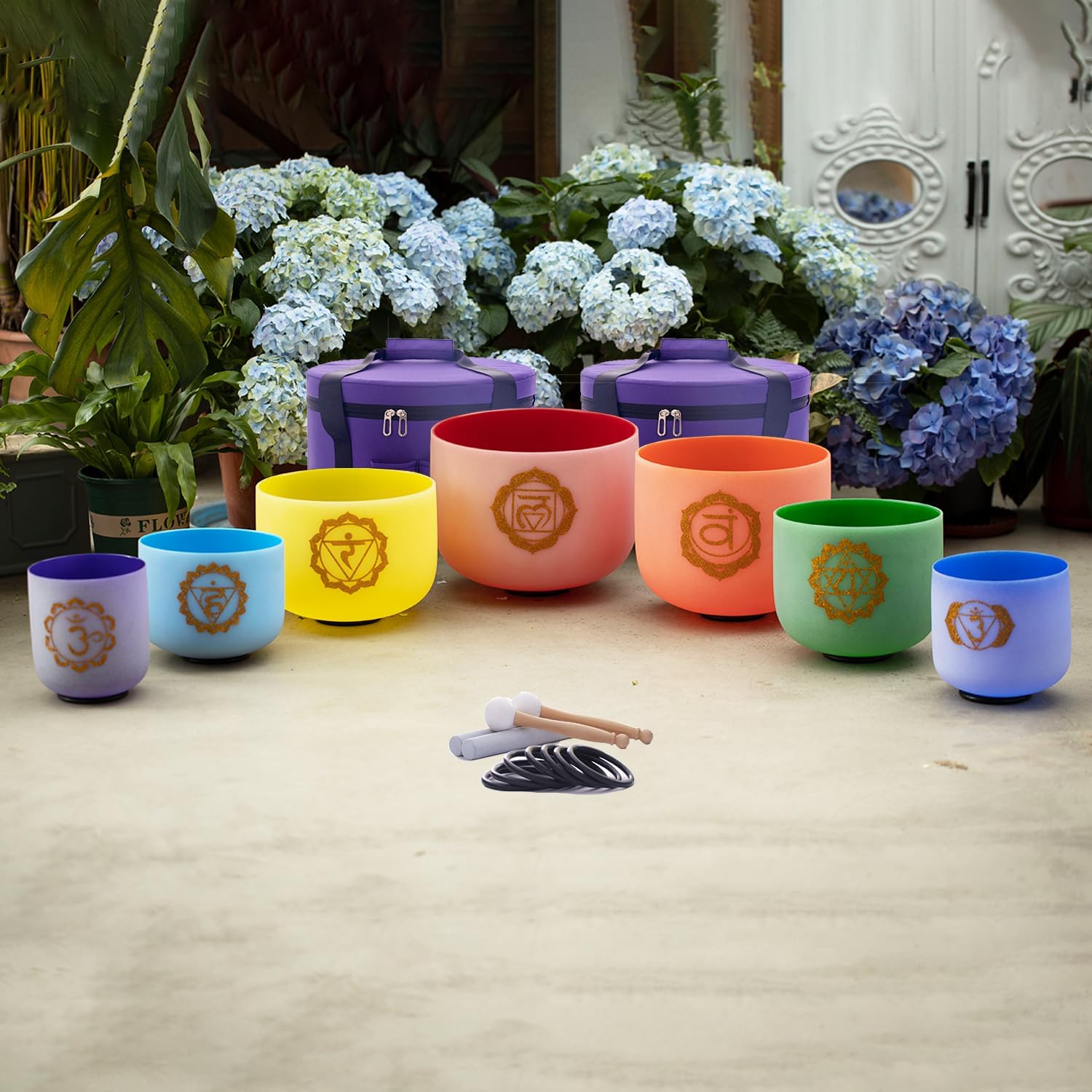 - 1. Package including:7 pcs bowls from 7inch to 12inch, Including 12"C 11"D 10"E 9"F 8"A 7"G 7"B. The crystal singing bowl set comes with two heavy duty carrying cases and each singing bowl is housed in padded tank inside the carrying cases. 2pcs suede strikers and 2pcs rubber mallet ,7pcs O-rings ,and 5pcs insert protection are packed in bundle pockets.