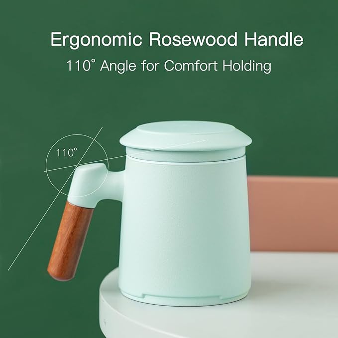 - MATTE HAND SPRAYED TEXTURED GLAZE: Zens tea infuser mug is designed by professional artists, The eye-catching light green glazed is hand-sprayed by artisan with a grainy texture, while the interior glossy glaze that makes it easy to see the color of the warm tea. The artistic wooden handle creates an aesthetic vibe, adds a vintage touch to your coffee and tea table. what a fantastic tea cup for Tea Lovers gifts.