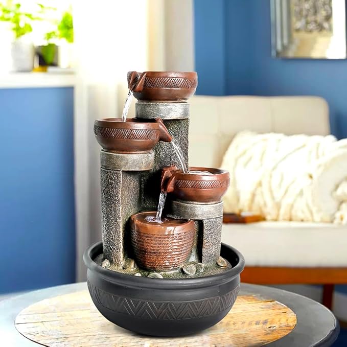 - When the water gently glides from the top to the bottom bowl, there comes the charming soothing flowing sounds, the soothing cascading table top fountain brings you into the peace and beauty of nature, makes you feel peace and relaxing.