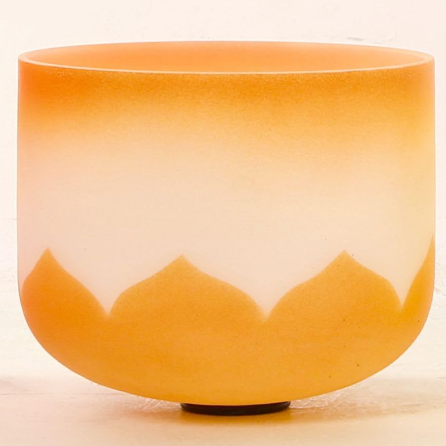 - Leize Crystal Singing Bowl Lotus Design Colored Rim Chakra Tuned Quartz 11” wide Orange 432hz D Note with Suede Striker