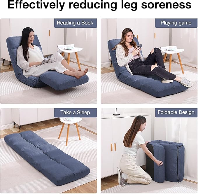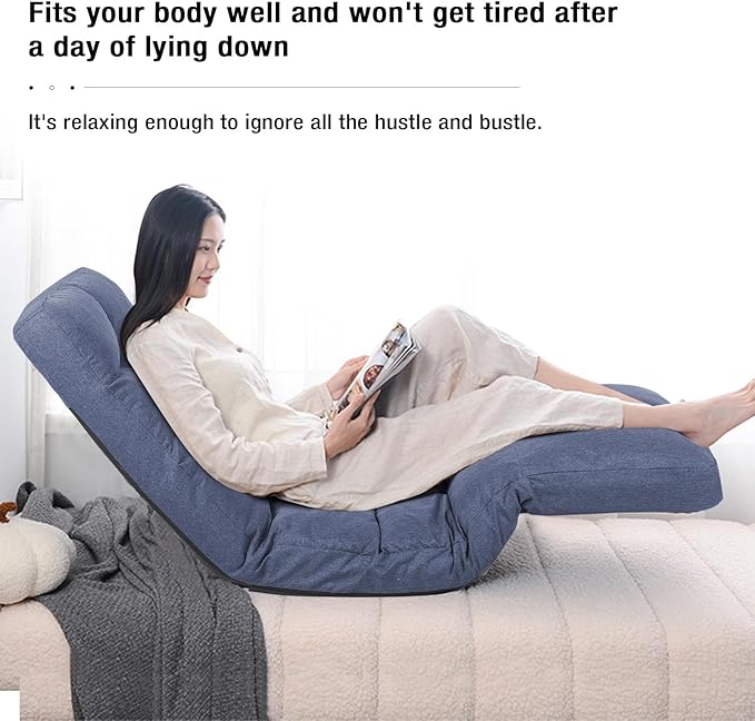 Floor Chair with Footrest Adjustable Backrest with 14 Positions Footrest 5-Position Adjustment Foldable Floor Gaming Chair for Easy Storage Linen Fabirc Chaise Lounge 086 (Blue)