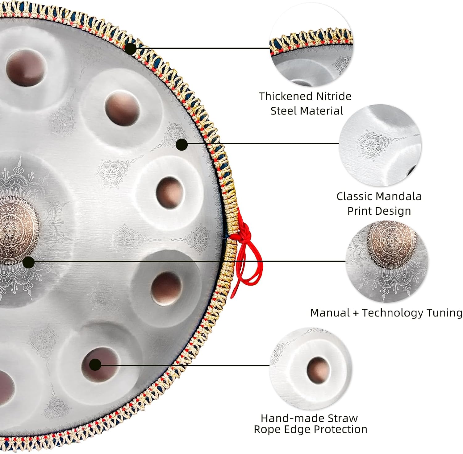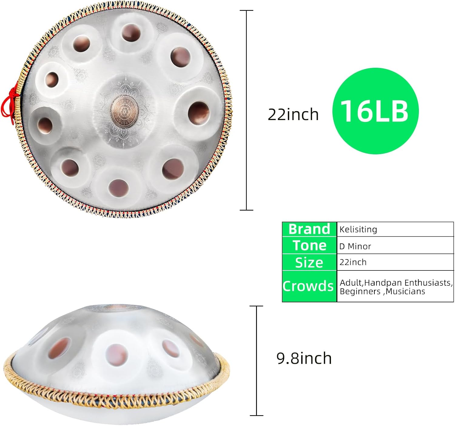 Handpan Drum,22inch 10 Sounds D Minor Silver Print 432hz Handpan,Adult's Steel Hand Pan Instrument,Sounds Clean Clear Ethereal