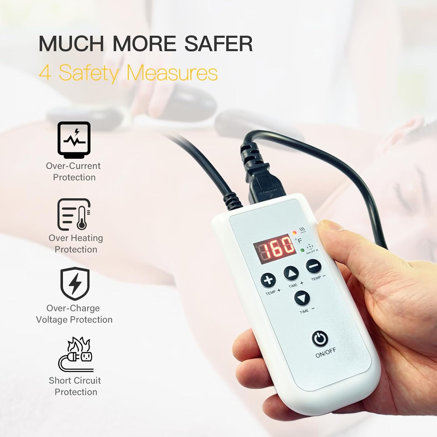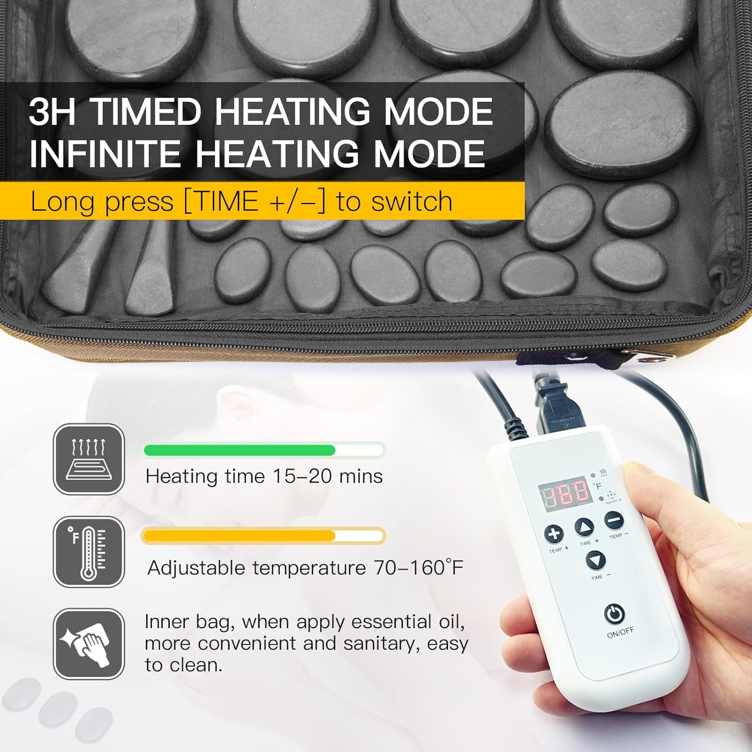 - 【TEMPERATURE CONTROL】- Adjustable temp: 70-160°F (20-70°C). Equipped with a 3-hour automatic power-off safety feature. For continuous heating, press the "TEMP+" and "TEMP-" buttons simultaneously—ideal for extended massage sessions.