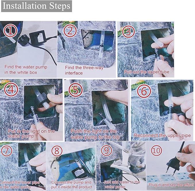 - ⛲【Easy to Install】: All you need to do to install the tabletop rockery is place the ball, lamp and atomiser where you want them, connect the pump to the water pipe behind the wigwam and connect it to the power supply and you're ready to go. On top of that, the lower part of the wigwam has a small fish pond where you can keep a few small goldfish for added vigour.