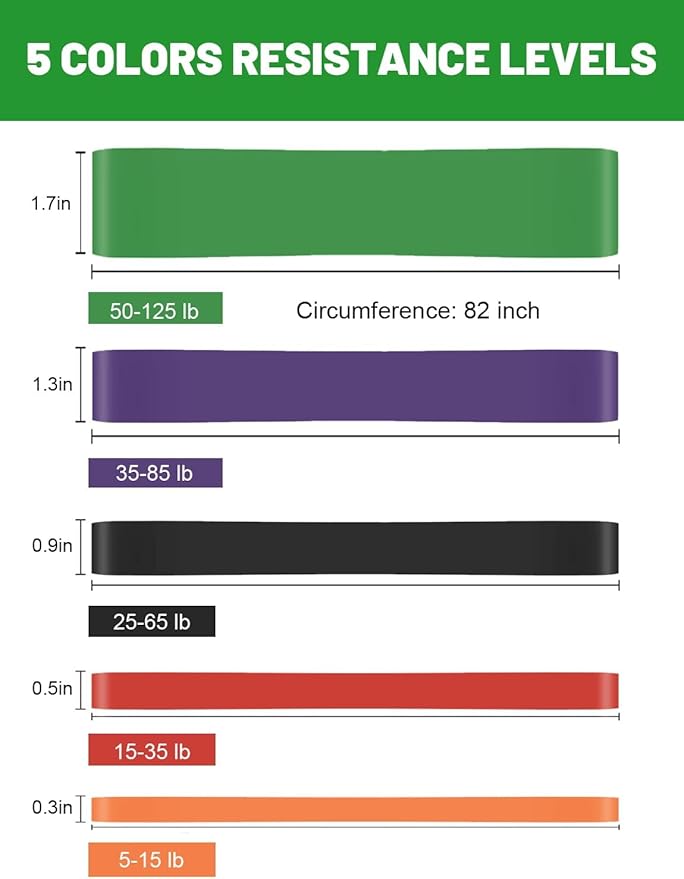 - Package Included: 5 pull up bands, 1 carrying bag and 1 workout guide. Resistance bands are Orange 5-15 lbs, Red 15-35 lbs, Black 25-65 lbs, Purple 35-85 lbs, Green 50-125 lbs. Use these exercise bands to perform rows, pulls, raises, and fly workout sets to exercise your arms, back, hips, legs, chest, and abdominal region