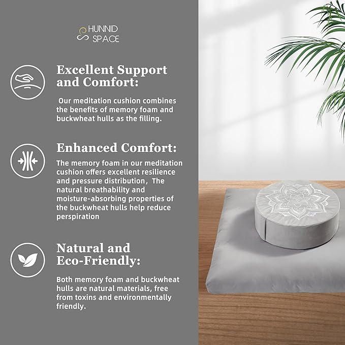 - ⚡ DUAL-LAYERED SUPPORT SYSTEM | DESIGNED TO LAST ▪️ Meditation Pillow: 16" x 5" | 100% natural buckwheat hulls for adjustable firmness ▪️ Meditation Mat: 32" x 3" | High-density shredded memory foam rebounds instantly → Never flattens! Retains shape for years with daily use.