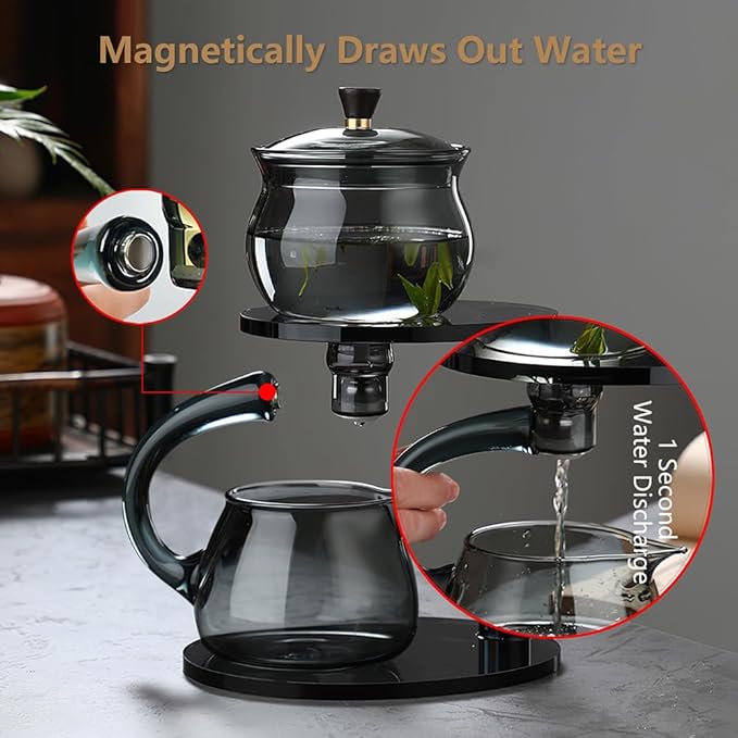 - ☕ 【CREATIVE DESIGN】: The semi-automatic tea maker magnetically sucks out water, which is convenient and quick, through the handle magnetic way adsorption steel beads to open the water filter hole, smooth water flow. Elegant shape, crystal clear, soup color panoramic view, enhance the quality of life