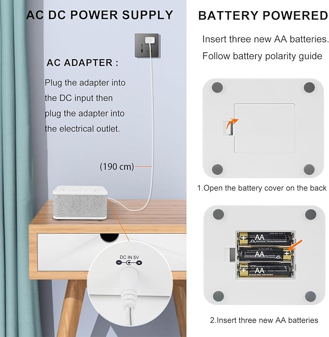 - [Plug in or Use battery for White Sounds Machine] โ The sleep noise machine is powered by an included AC adapter with a micro USB cable or 3 AA batteries (Not included), making it an easy portable solution for home, office and travel.