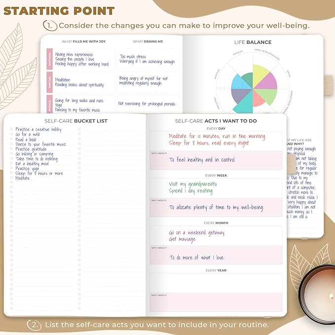 - BUILD A HAPPIER & HEALTHIER MINDSET FOR YEARS TO COME: This self care notebook is filled with prompts, open-ended questions, wellness trackers, and many other tools to help you pinpoint the changes you can make to improve your well-being.