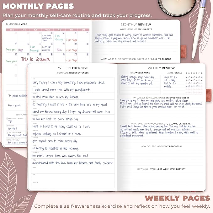 - BUILD A HAPPIER & HEALTHIER MINDSET FOR YEARS TO COME: This self care notebook is filled with prompts, open-ended questions, wellness trackers, and many other tools to help you pinpoint the changes you can make to improve your well-being.