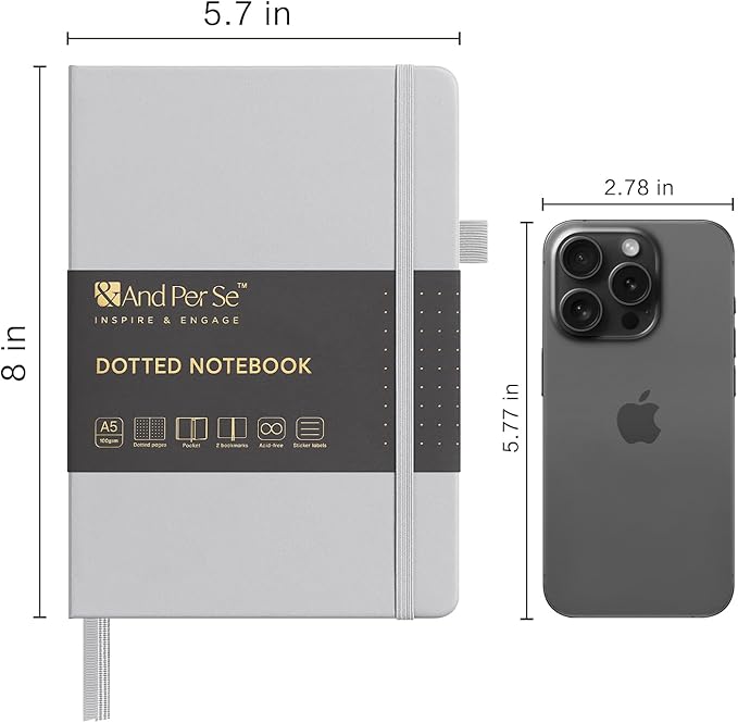 &And Per Se Dotted Journal Notebook, A5 Hardcover Leather Bullet Dotted Journal, 160 Pages 100 gsm Thick Paper, 3 Sheets of Stickers Included- 5.7'' x 8'' (Grey)