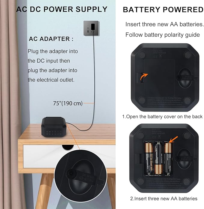 - [Plug in or Use battery for White Sounds Machine] โ The sleep noise machine is powered by an included AC adapter with a micro USB cable or 3 AA batteries (Not included), making it an easy portable solution for home, office and travel.