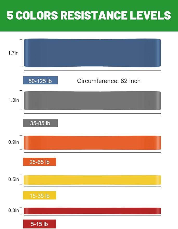 - Package Included: 5 pull up bands, 1 carrying bag and 1 workout guide. Resistance bands are 5-15 lbs, 15-35 lbs, 25-65 lbs, 35-85 lbs, 50-125 lbs. Use these exercise bands to perform rows, pulls, raises, and fly workout sets to exercise your arms, back, hips, legs, chest, and abdominal region