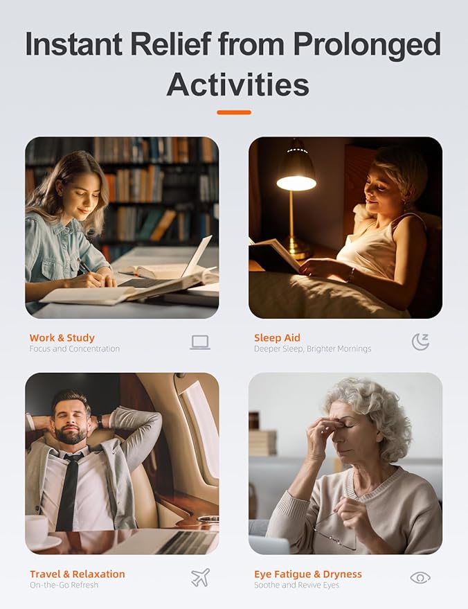 - Gentle Heat Comfort: Enjoy a calming heat experience that helps alleviate dryness and tension around the eyes, promoting a deeper sense of relaxation