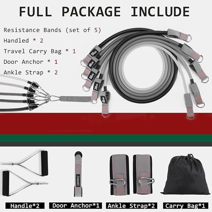 - Quality That Matters - Uncompromising quality in every detail. Our resistance bands are crafted to last, ensuring durability and reliability. The set includes 5 tube bands, 2 soft cushioned handles, 2 ankle straps, 1 door anchor, and a convenient carrying bag.