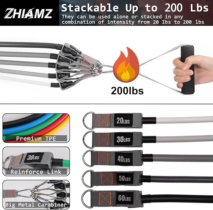 - Elevate Your Workout Everywhere - Unleash the advantages of our adjustable resistance bands set—equivalent to 200 lbs. Amplify your fitness routine with 20 lbs, 30 lbs, 40 lbs, 50 lbs, and 60 lbs bands that seamlessly combine for maximum impact.