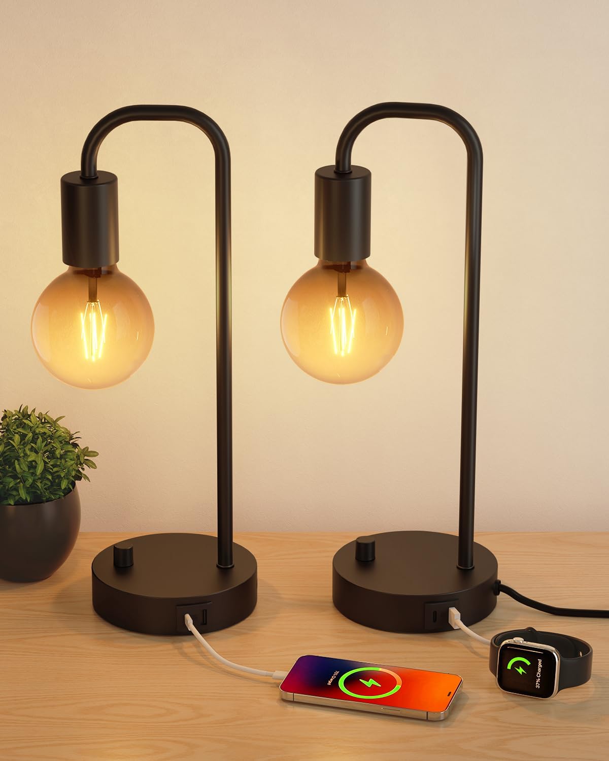 ONEWISH Industrial Table Lamp Set of 2 with USB C&A Charging Port, Stepless Dimmable Nightstand Bedside Lamps for Bedroom,Desk Lamps with 2700K Black Gradient Bulb for Reading Living Room,Office