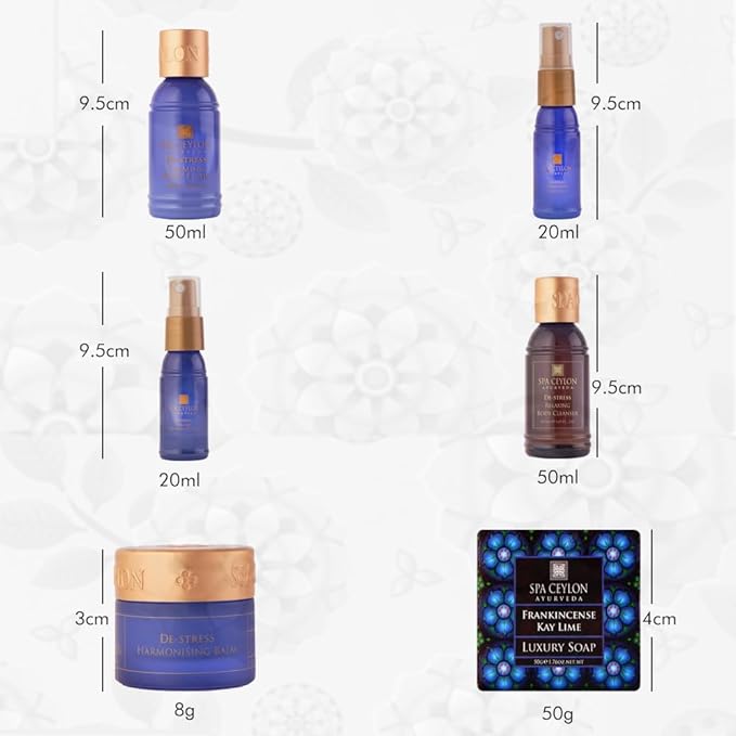 - This set includes - De-stress - Relaxing Body Cleanser - 50ml, De-stress - Calming Body Elixir - 50ml, De-stress - Calming Body Massage Serum - 20ml, De-stress - Harmonising Essence Mist - 20ml, Frankincense Kay Lime - Luxury Soap - 50g, De-stress - Harmonising Balm - 8g.