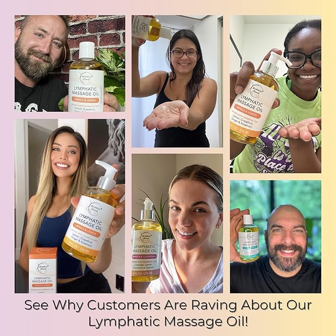- Soothing Lymphatic Relief: Harness the gentle properties of Calendula and the restorative power of Arnica in our massage oil, designed for lymphatic wellness. Infused with Sweet Almond, Grapeseed, and Jojoba oils, this blend promotes lymphatic flow, aids in swelling, and soothes the skin, making it ideal for a gentle, restorative lymphatic massage experience.