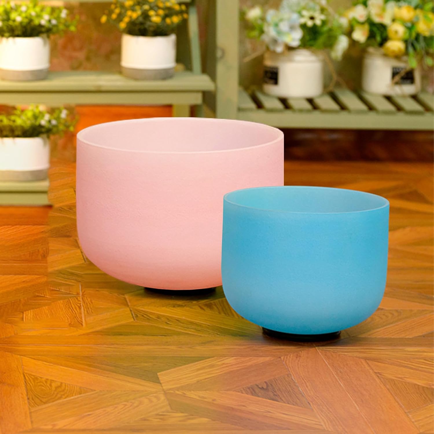 - 1. 2 pcs singing bowls from 8 inch to 10inch, Including 432hz 8"G Blue 10"C Pink Singing bowl. The crystal singing bowl set comes with a heavy duty carrying case and one suede strikers ,2 pcs O-rings .