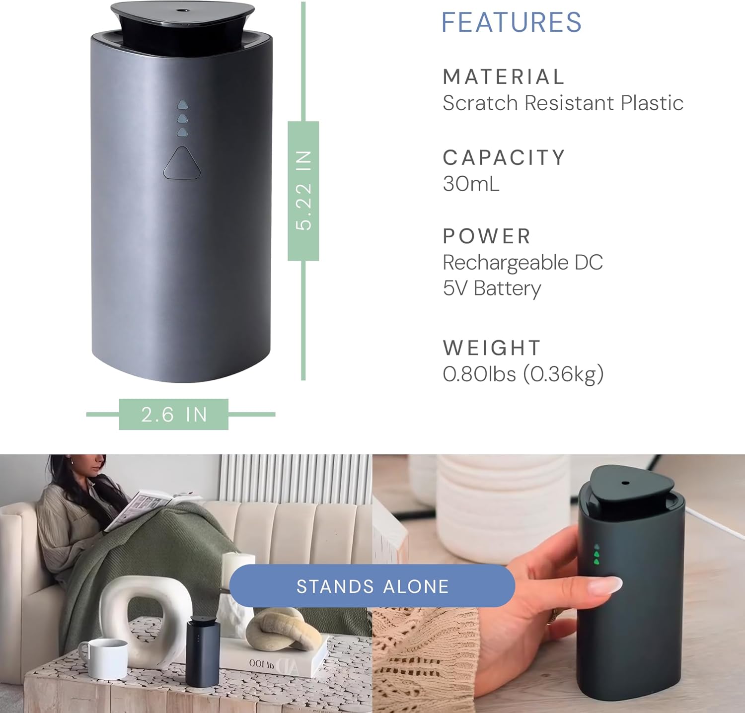 - LONG-LASTING FRAGRANCE: No need to constantly recharge, with up to 80 hours of use on the low setting, this rechargeable mini diffuser keeps your space smelling fresh for days, allowing you to enjoy your favorite scents without worry