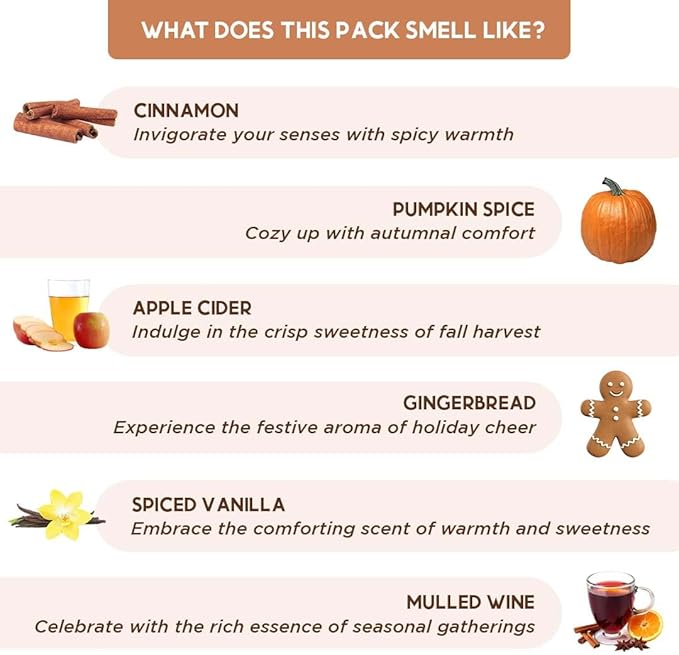 - Scent : Cinnamon, Pumpkin Spice, Apple Cider, Gingerbread, Spiced Vanilla, Mulled Wine