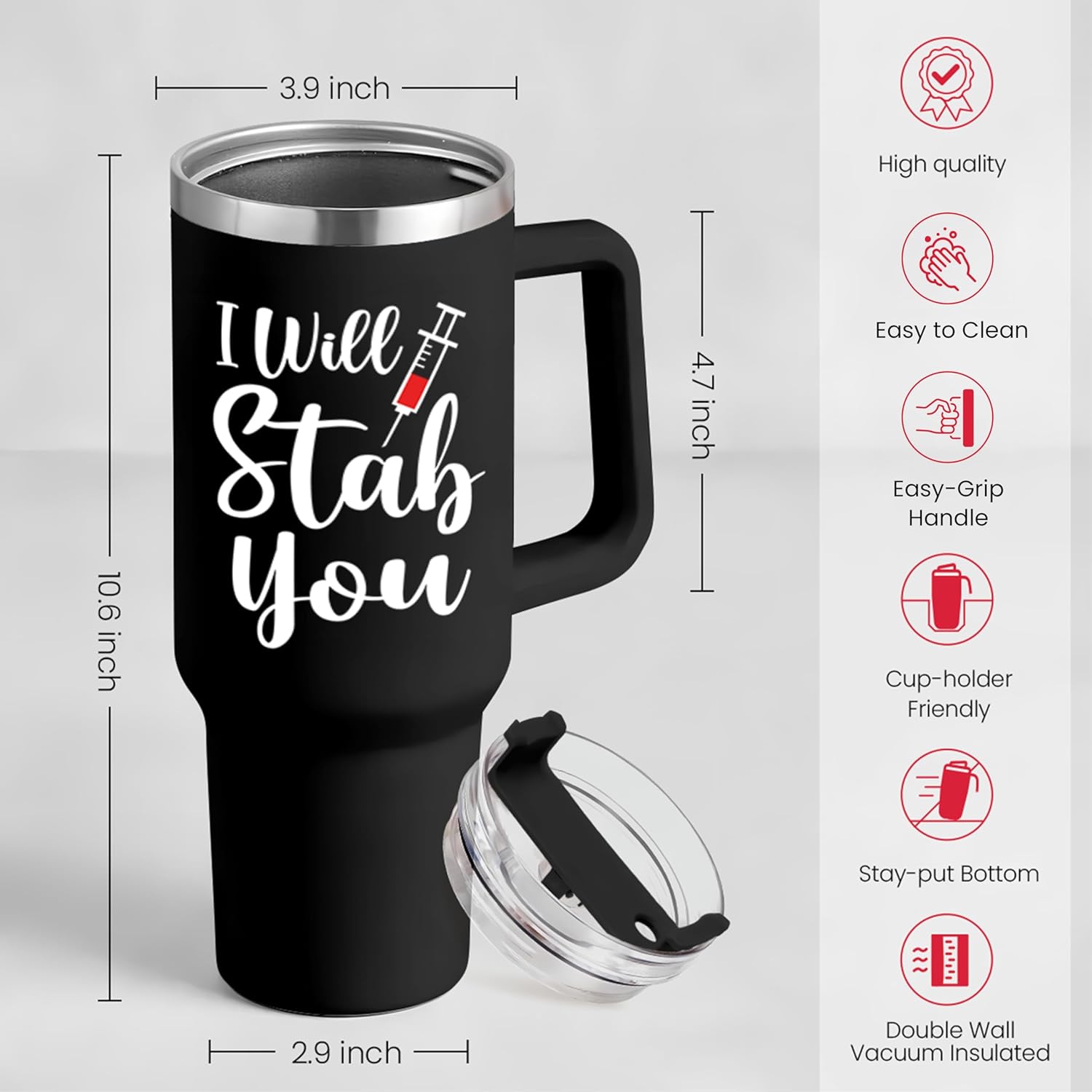 SANDJEST Nurse Gifts I Will Stab You Tumbler with Handle 40oz Stainless Steel Insulated Coffee Cup Funny Nurse Week Present, Nursing School Graduation, Appreciation Gifts for RN Nurses